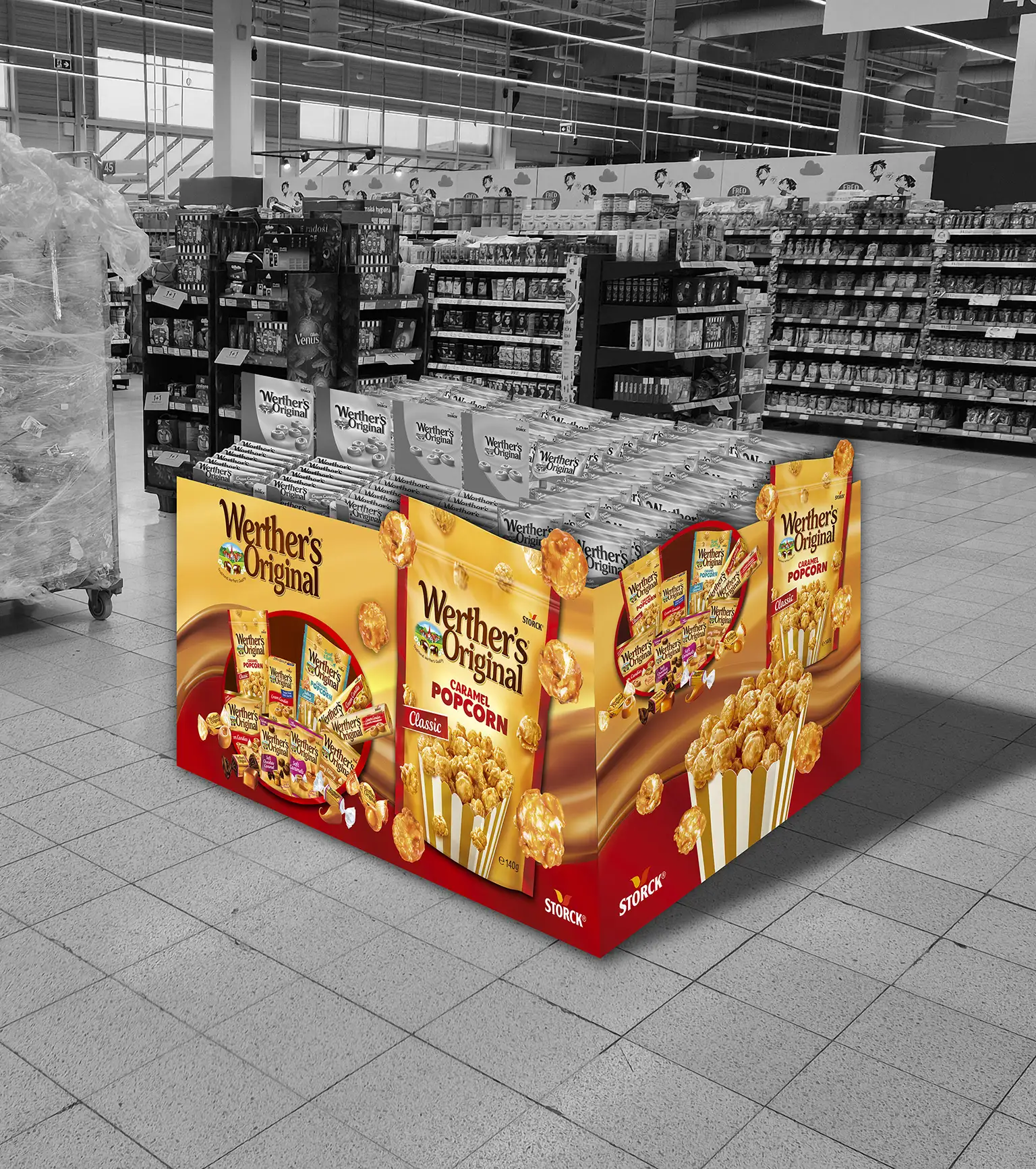 Zadání: Navrhnout poutavou grafiku pro omotávku palety s produktem Werther’s Original Caramel Popcorn, která má fungovat jako sekundární vystavení (second placement) v uličkách supermarketů a podpořit impulzní nákup.